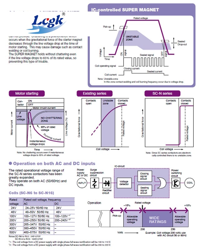 The SC-N1 to SC-N5A do not have the SUPER MAGNET. These contactors feature compact size, arc extinguishing mechanisms with a high breaking efficiency, low power consumption, easy operation, and ratings up to 660 volts. It operates on both AC and DC power supply, has a wide operational voltage range with No tendency to “chatter". It eliminates contact welding or coil burning and reduces power consumption